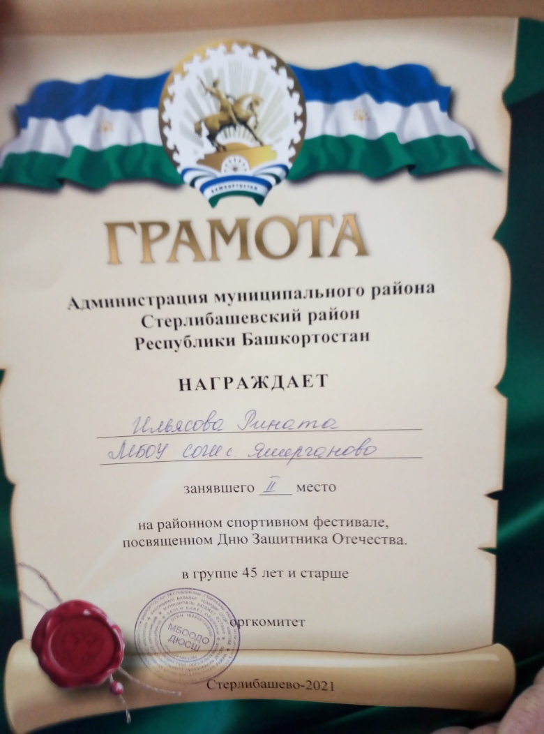 19.02.2021 г. в СОК "Стерля" прошёл традиционный мужской спортивный фестиваль посвященный ко дню защитника Отечества. На мероприятии приняли участие и учителя нашей школы: Ильясов Р.Т. и Галимов Р.Р. Соревнования прошли в трёх возрастных группах: от 18 до 29 лет; от 30 до 45 лет; от 45 лет и старше. В возрастной группе 45 лет старше Ильясов Ринат Тагирович занял 2 место среди организаций района.